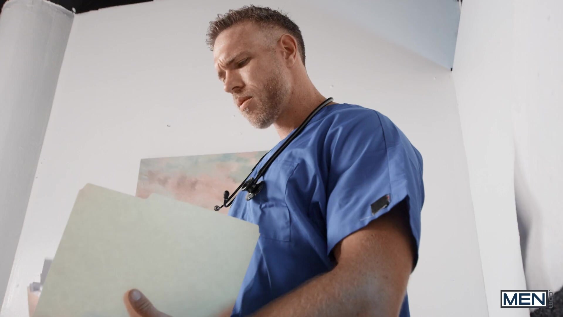 Dr. Alex Mecum rushes to put Bo Sinn in the scanner to discover the cause of his symptoms, but as Bo's hospital gown rides up, the doc can immediately see what the issue is: a big set of anal beads in Bo's ass. Alex gently removes the beads, then fingers the patient's hole as he sucks Bo's big dick. It's time for Bo's treatment as Alex fucks him missionary in the scanner, giving Bo's hole the filling it needs. Bo may be bottoming, but he shows Alex who's boss as he demands to get fucked harder, then pushes the doc down on the bed and rides his dick. Bo bends over to get fucked doggystyle till Alex pulls out and cums on his ass, then pushes the doc down to take a hot facial.