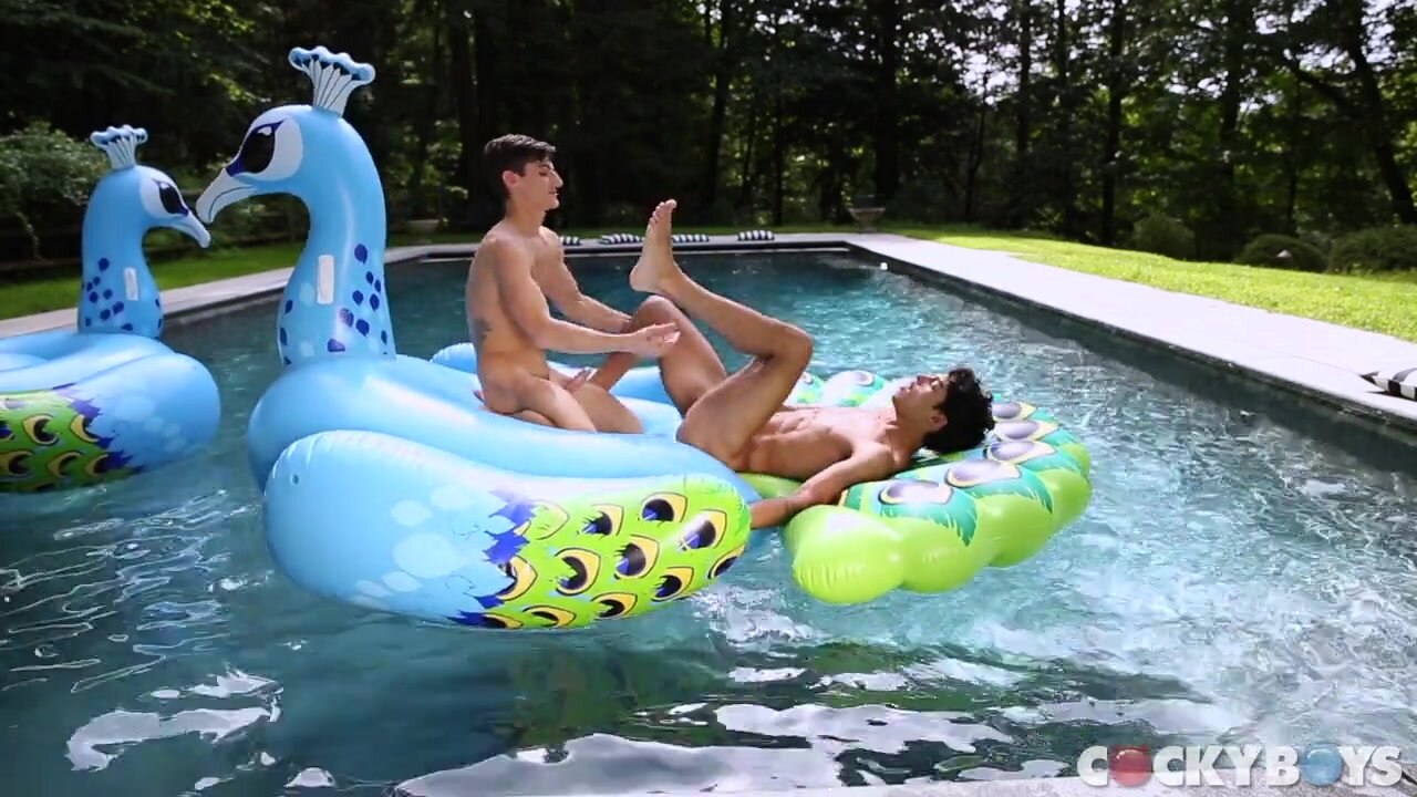 There's more condom-free fun at the Camp CockyBoys pool, this time with Nico Leon & Aiden Ward! After getting Aiden hard & teasing him, Nico gets him to suck him while floating atop the huge peacock pool inflatable. Soon Aiden climbs aboard the raft to relentlessly suck Nico so well that Nico just has to pleasure him right back. BUT, Aiden wants more.