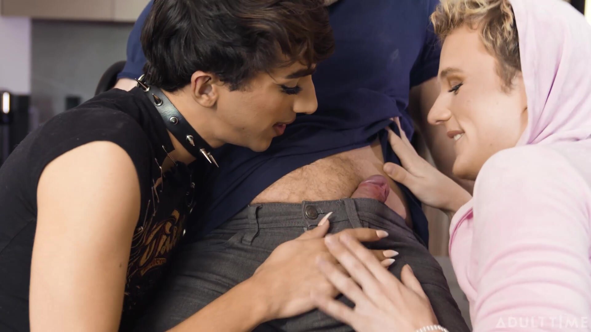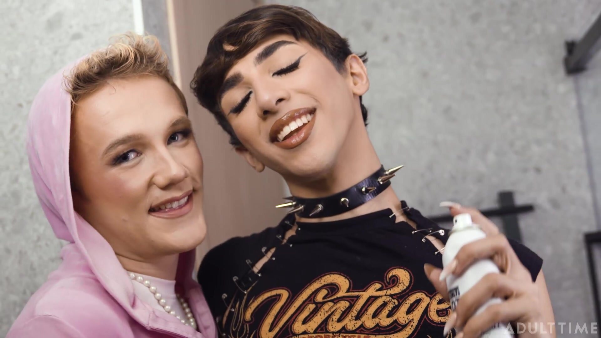 Femboy besties Foxy Alex and Benny Fox are applying makeup side-by-side, giggling with excitement and anticipation. They're getting ready for Mateo Tomas to arrive, and have made sure to get dolled up just for the occasion. Benny looks as delicious as a strawberry sorbet, wearing a pink hoodie and pink panties, accentuated by delicate earrings and a lovely pearl necklace. Foxy's opted for something a bit more rock-n-roll, with torn jean-shorts covering black fishnets, and a studded collar wrapped around his neck. Together, they're like two parts of a whole, and when Mateo arrives, he can barely decide who to fuck first. Lucky for him, Foxy and Benny work best as a team. They get on their knees to give him a double blowjob, and then switch out for some spit roast fun. Mateo then gets the femboys into a stack and takes turns pounding their tight assholes as they squirm on top of each other. The grand finale is an anal train that leads to multiple creamy cumshots, making this one hookup these besties will never forget.