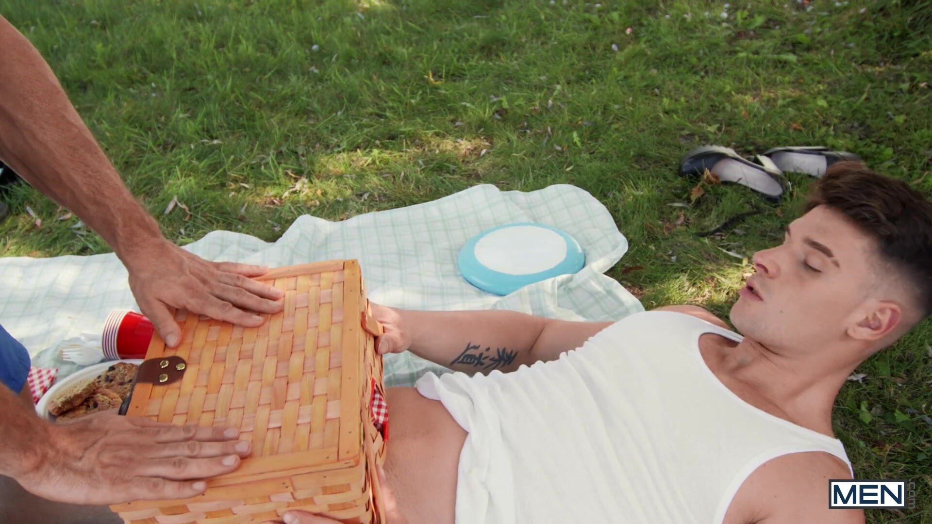 Malik Delgaty discovers a hole in the bottom of the picnic basket as his girlfriend sets up the birthday picnic she planned for her bestie. Malik is horny, but before he can do anything about it, the other guests arrive. The friend has a new BF in tow, Dom King, and when Malik sticks his dick in the picnic basket, Dom takes a look and eagerly strokes it! While their GFs play frisbee, the guys try a different game as Dom sucks Malik, then brings him to the car where he rims him and bends Malik over the seat to fuck his hole! Malik takes Dom's dick in missionary, then rides him. The top cums on Malik's ass, and Malik cums in Dom's mouth before the guys go back to their GFs.