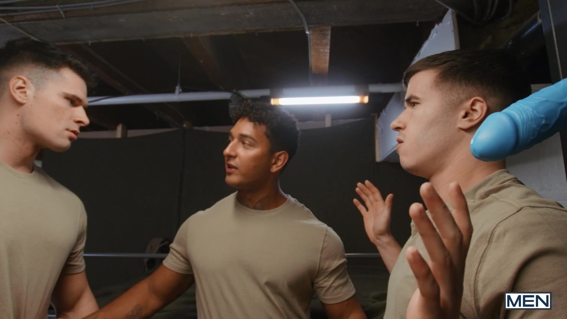 Horny soldier Maverick Sun thought he finally had a chance for some quality time with his dildo, but his roommates walk in on him, and Malik Delgaty threatens to report it! Kenzo Alvarez tells the hunk to chill out... and that night after lights out, he sticks his dick through a hole in the mattress for Maverick to suck. Malik cums in a sock as his roomies break regulations, and Kenzo fucks Maverick doggystyle way better than his dildo could. Kenzo pounds the bottom in missionary and spoon, reaching around to stroke him till he cums, and gives Maverick a facial. When the bottom finds Malik's cum sock, he realizes the top wasn't as uninterested as he seemed...