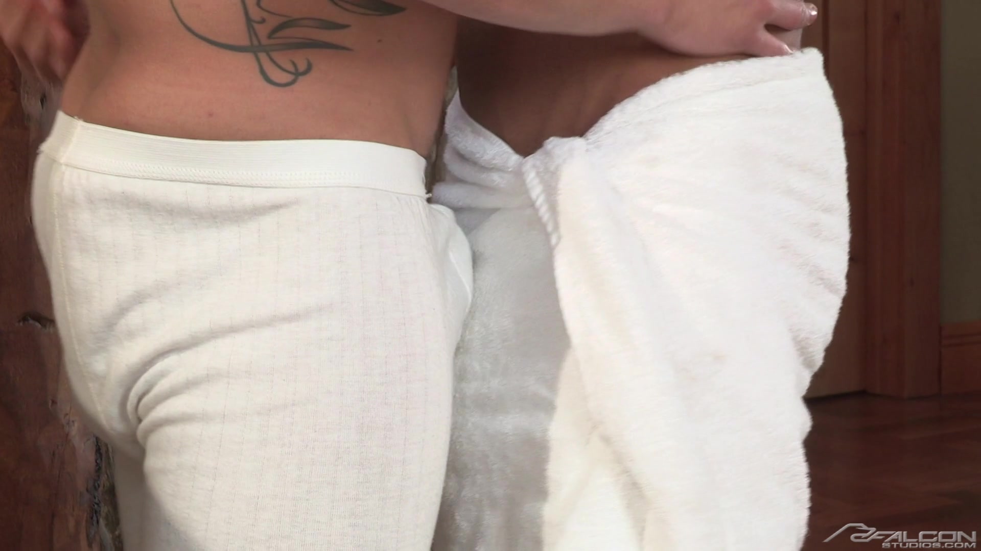 Smooth, muscled Sean Zevran is on his way to the shower when he finds hunky Jordan Boss with a huge boner outlined in his long underwear. It only takes a glance to confirm they're both interested. Locking lips, Sean's towel falls away, revealing his own rock-hard, uncut cock. Jordan eagerly gives Sean a wet, passionate blowjob. He wants to admire Sean's backside too, so Sean bends over the stairwell railing, giving Jordan full access to his perfect bubble butt. Jordan's cock has been throbbing away inside his long johns, begging for escape, and Sean finally gives it the attention it demands. With his lips around Jordan's thick tool and his free hand cupping Jordan's balls, Sean delivers a saliva-dripping blowjob. Jordan's cum spurts upward in gigantic, thick ropes, splashing onto Sean's chest and rolling down in white rivulets. Still on his knees, Sean jerks his massive meat and unleashes his huge load onto the hardwood floor