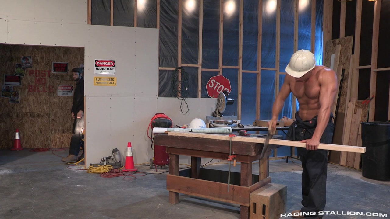 Beefy Jacob Tyler – shirtless and smooth – is working hard on the job, sawing a piece of lumber. Bearded Tegan Zayne pulls out his own hard wood and shows it to Jacob, who knows a hungry bottom when he sees one. Grabbing Tegan by his coveralls, Jacob pushes Tegan down to his knees – the perfect position for Tegan to deepthroat Jacob’s huge woody. Holding the back of Tegan’s head, Jacob takes charge and gives Tegan a rough, slobbery face fuck. The blowjob has Jacob hungry for more; he bends Tegan over to expose the hairy, pink hole. Jacob uses his tongue and fingers to tease Tegan’s ass, generating moans of ecstasy. Still standing, Jacob slides his thick rod into Tegan’s slick hole. The power and energy of Jacob’s fucking is astonishing. Tegan’s back muscles ripple; Jacob glistens with sweat. Sweeping the tools off the workbench, Jacob clears a space for Tegan to get fucked even harder. Tegan gets on his back with his ass hanging off the edge of the table; it’s just the right height for Jacob to deliver an intense pounding. As he’s getting fucked, Tegan works his rock hard cock and sprays all over his stomach. Jacob blasts his load onto Tegan’s face, and Tegan deepthroats Jacob to suck out the last drops of cum.