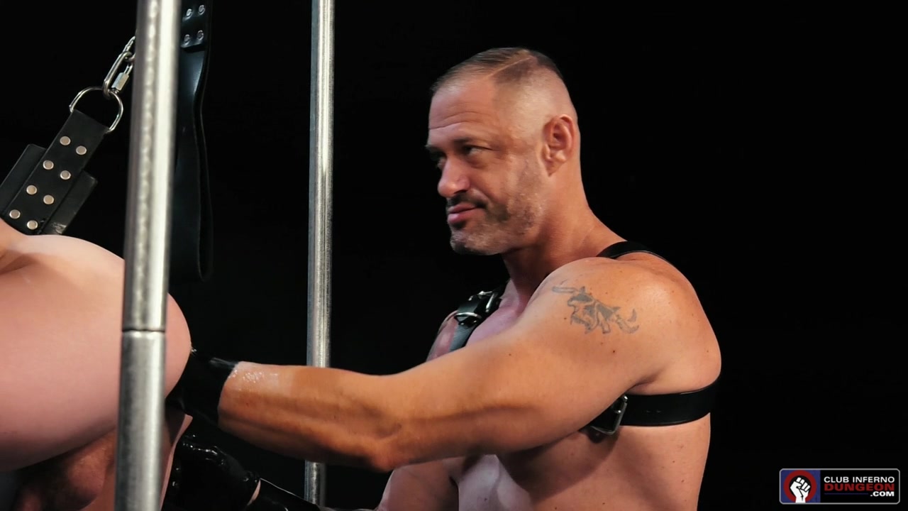 Blond and smooth, Cody Winter sprawls across a leather bench. His sir, D Arclyte, rubs his hands along Cody's lean body. Their shiny black harnesses squeak against the leather bench as Cody rips off his codpiece to reveal his throbbing, uncut cock. D expertly administers a blowjob to his boy, then flips him over to eat Cody's eager hole. Eager to please his daddy, Cody moves to a sling where he opens up his ass for D's fat fist. As D slides his knuckles past Cody's muscle ring, the sub's moans get more and more intense. Every movement of D's hand against Cody's guts elicits gasps and yelps of mind-blowing pleasure. Faster and faster, D pumps his fist into Cody's hole, passing his wrist. Passing his leg over D's arm, Cody faces forward and fucks himself on his sir's big fist. 'You gonna cum for daddy?' asks D. 'Oh yes please,' replies Cody. With Cody's hole gaping, D wraps his hands around Cody's neck and constricts his airflow, and the feeling of being totally at the mercy of his sir impels Cody to shoot a massive, spurting load into the air. When Cody's orgasmic moans subside, D asks him, 'You ready to take care of daddy?' 'Yes sir!'