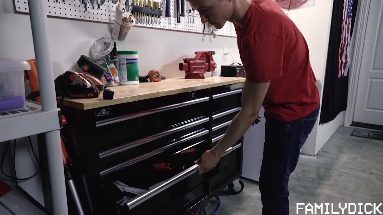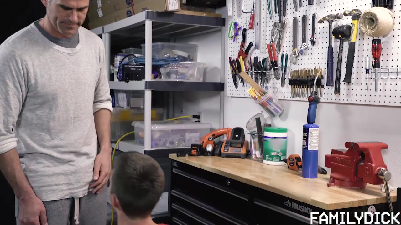 The dad told me that he’s been watching his son grow up, getting more handsome day after day. In this video, that admiration gets the better of him and he takes his son’s hole right there on his workbench.