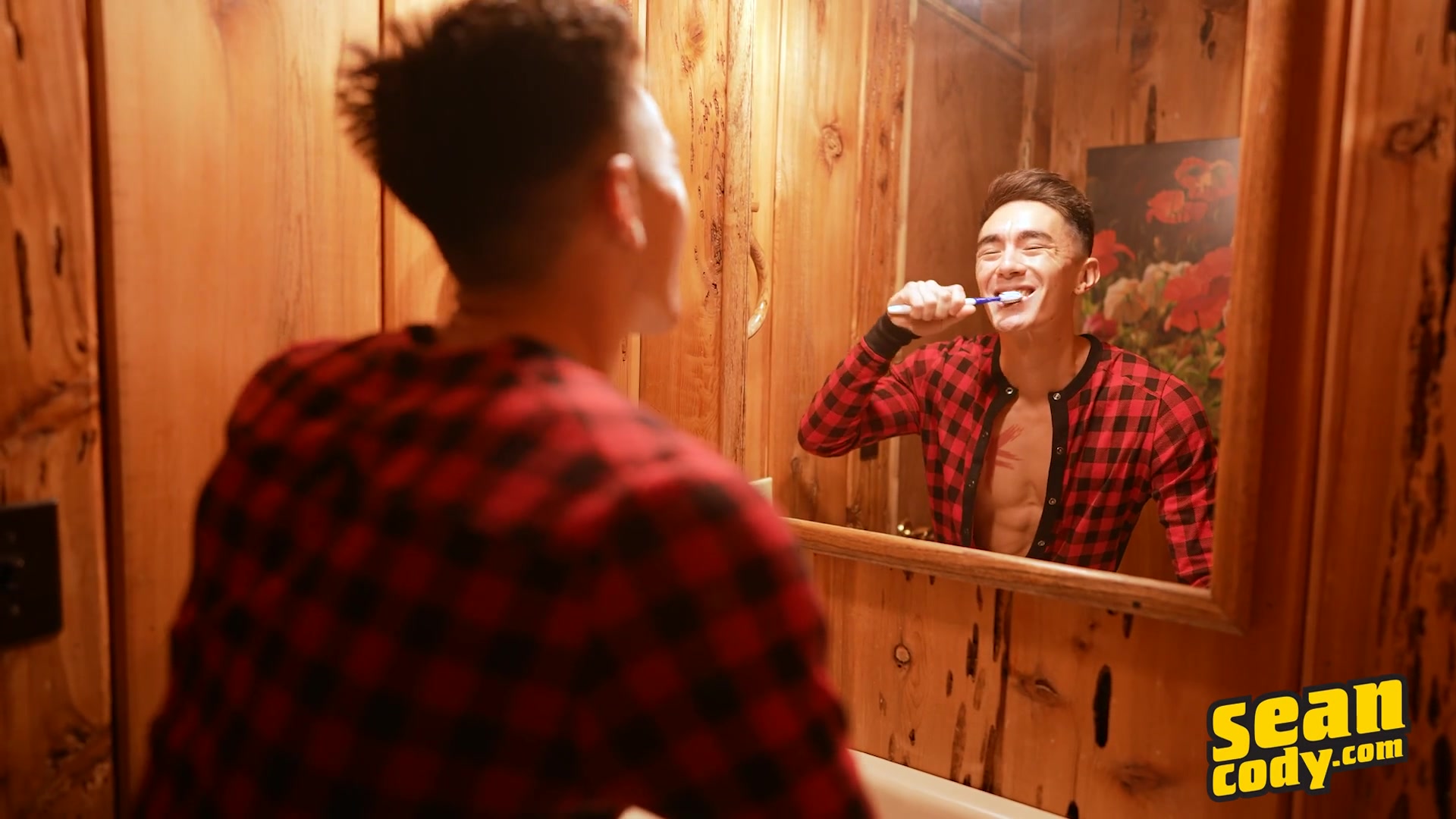 As the day begins at the cabin, Josh, Justin, and Sean are cuddled up in bed together, making out so intently they don't even notice Devy sneaking into the cabin and up the stairs to peep on them! Sean and Justin take turns sucking Josh's cock, then Justin sucks them both before taking Josh's dick doggystyle as he sucks Sean's cock. As Devy watches, rubbing his hardening dick, Justin and Josh 69, with Sean lifting Justin by the ankles so he can fuck Josh's mouth too! Then it's Sean's turn to take Josh's cock before Justin gets a chance to fuck Sean. The bottom cums and Josh gives Sean a big facial, then Justin pulls out and cums... before they discover Devy, naked and playing with himself!