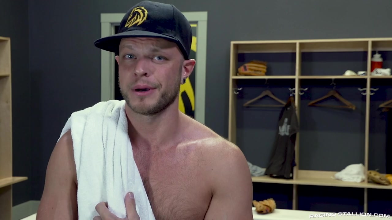 Bat boy, Sharok, is cleaning up the locker room when players Ricky Larkin and Wade Wolfgar enter from the showers after losing a game. They pick on Sharok for being their bat boy but Sharok knows that they really need to blow off some steam after their loss. Sharok gets on his knees and opens his mouth wide for Ricky and Wade to take turns fucking his eager face. Sharok gets the guys rock hard and bends over to let them get a taste of his hairy hole. Wade is the first to suck on Sharok's hairy crack and gets him nice and opened up for his buddy, Ricky, to fill up with his big raw bat. Ricky slides inside and pounds away as Wade fills Sharok's face with his thick cock. Wade wants his bareback turn now inside Sharok's dugout and takes up the rear with his fat bat. It's almost too big to fit in Sharok's hole but Sharok is determined to take it balls deep and rolls onto his back with his legs in the air. Wade stretches the hole in front of him as Ricky fucks Sharok's face. The guys take turns railing both of Sharok's holes from each end until Wade wants his turn as the catcher. As a last-minute pinch-hitter, Wade goes from pitcher to catcher and lies back to let Ricky pound his ass. Ricky plunges Wade's open hole until he pulls out and sprays Wade's hairy balls with thick jizz. Next up, Sharok steps off deck and up to the plate to fuck Wade until both spent studs blast all over Wade's furry body.