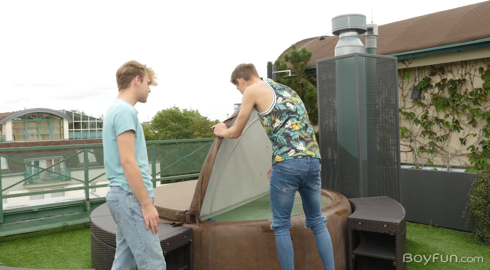 The two are soon leaving the terrace for the comfort of a nearby bedroom, their t-shirts soon off to reveal their smooth bodies as they make out on the bed, their pants slipping down to display hard uncut cocks bulging in their sexy underwear.